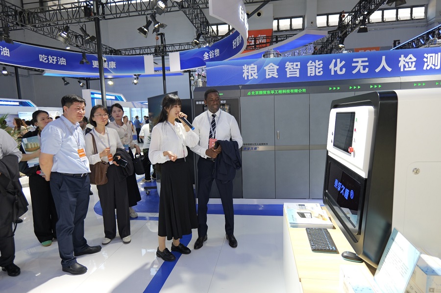 本次大會我院組織儲運所、質量安全所、品質營養所、加工所、檢測中心、中心實驗室六個部門以及所屬科技型企業國貿東孚參展,協同佳禾食品、谷道糧心、輕訴健康、星創儀器、天合云途、同福健康六家合作企業組團亮相,現場通過實物展示、產品品鑒、視頻演示等多種形式,結合AI機器人講解和趣味互動,全方位、多角度、創新性展現科技創新能力和院企合作成果。其中系列健康食品以及應急加工成套裝備、智能化無人裝備等受到與會代表的廣泛關注,多個?。ㄊ校┘Z食主管部門主要負責同志帶隊到展位參觀交流、參與品鑒,多家倉儲和檢驗檢測企業到展位洽談業務、咨詢綠色儲糧技術合作,新華社、央視新聞、中國新聞網、中國商報、北斗融媒等十余家中央、地方媒體對科學研究院系列科技成果和首席科學家進行采訪報道,還吸引安哥拉、阿根廷等外國駐華使節、FAO等有關國際組織代表等前來參觀交流和品鑒。